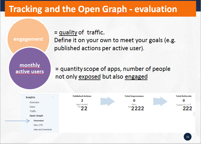 The measurement & tracking of apps poses a real problem for Facebook business users, as Facebook Insights for Apps presents a enormous number of diverse metrics. In our presentation, basing our opinion on Facebook PMD seminars, we’ve determined 4 of the most important metrics for app measurement in 2 crucial stages of the app development process. However, before getting to App measurement, it will be good to shortly go over what Open Graph is.