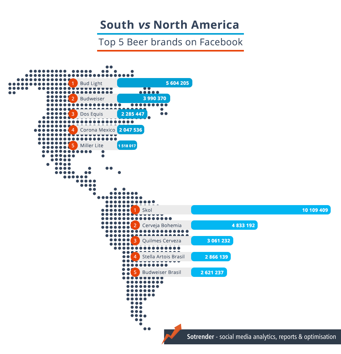 The first two places in the previous ranking inspired us to look closer at beer fans in North and South America. We have selected top 5 biggest Facebook beer pages, from both continents and compared the numbers.
