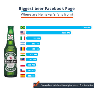 Heineken has an international Facebook profile with close to 12 million fans, which makes it the biggest Facebook beer brand in the world. But where are all these people from, we wondered… so we have checked. Most Heineken fans come from.. Brazil. The number of fans from the biggest country in South America is more than 2.3 million, so every fifth Heineken’s fan is Brazilian. The second place in the number of fans was taken by the United States with nearly 1.6 million people. Finally, the third on the podium is Italy, with more than 0.5 million Heineken fans. Among the top 10 countries of Heineken fans we can find also: Argentina, Romania, India, Malaysia, Poland, Chile and Spain.