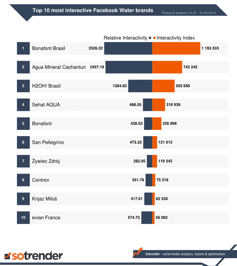 When it comes to interactions again two places on the podium are occupied by Brazilian brands.The absolute champion is Bonafont Brasil – the value of Interactivity Index of this page reached more than 1 million. This page has also the highest value of Relative Interactivity. Both indicators are a collective, weighted rate of all activities within one fanpage. Second in the number of collected interactions is Chilean brand – Agua Mineral Cachantun. And on the third place we can find again H2OH! Brasil.