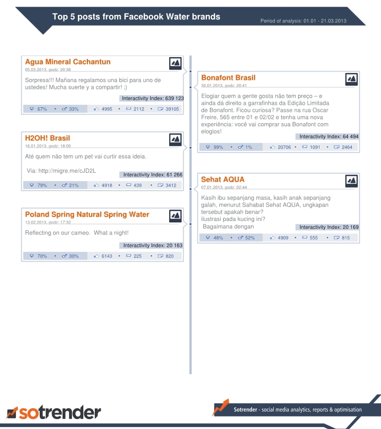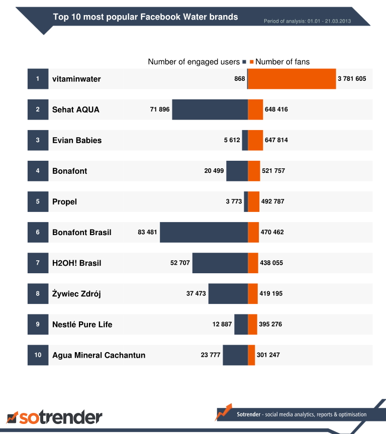 Recently we have celebrated St. Patrick’s day by presenting you top Beer brands in Americas and today let’s feast World Water Day! This time Sotrender Research Team has prepared the analysis of Water brands fanpages from all around the world. We have searched across the globe for the largest, the most engaging and the most interactive profiles and also the best posts. Here are our findings.