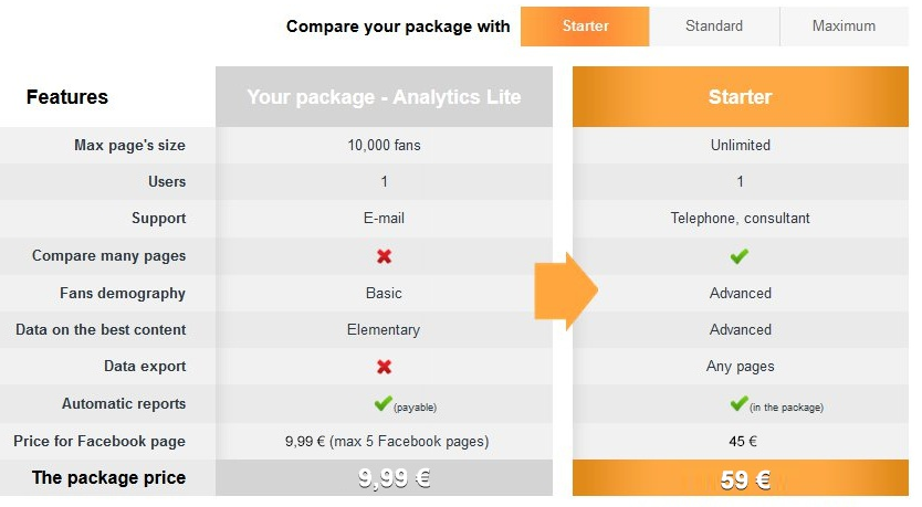 • Attractive price of €9.99 or $15 per month for each analyzed fanpage