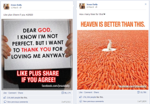 The arabic Facebook page is a profile of Sheikh Mahmoud al-Masri. In this ranking Jesus appears to be almost 6 times more popular than Barack Obama, but Cristiano Ronaldo and Vin Diesel had on average more interactive posts because they published less of them. As you can see, the difference between Jesus Daily and commercial pages is enormous and we can say that there is no real competitor for JD. However, it’s posts tend to beg for likes, comments and shares with short and simply messages. Let’s see examples:
