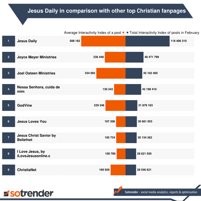 In terms of interactivity Jesus Daily is much more popular. It may be an effect of various factors, but the figures included in this analysis prove that thanks to social media strategy basing on frequent simple post, Jesus Daily is really the most interactive Facebook page on Facebook.