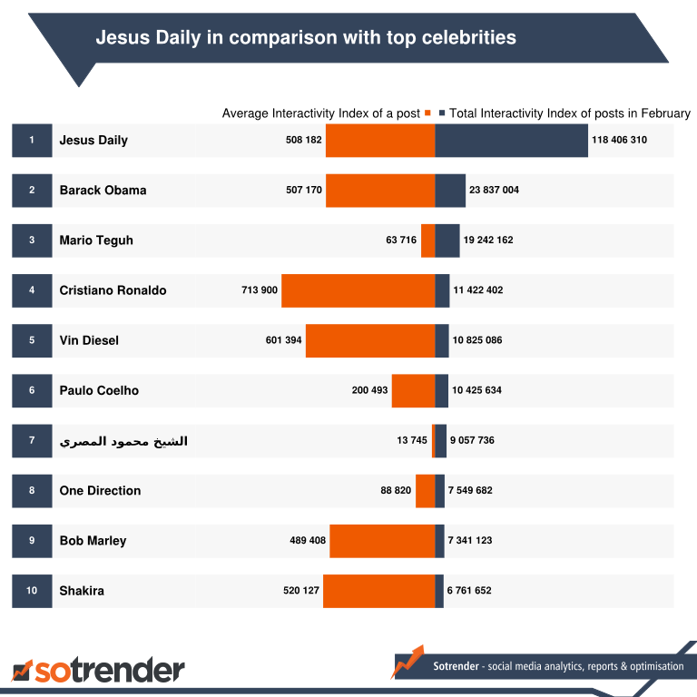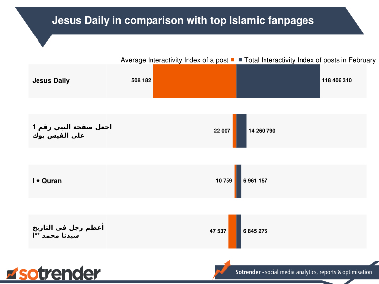 Some time ago we published a post concerning Jesus Daily which is the most interactive Facebok page on Facebook. Today we wanted to compare it with other pages including Christian, Islamic and commercial ones. One of the results it the fact that the key to success of Jesus Daily is publishing short and frequent posts without any hidden corporate message.