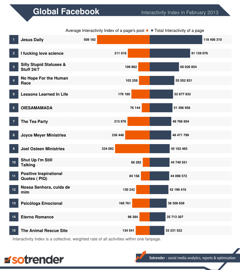 Taking into consideration how much money is being spent on social media marketing, it’s surprising that there are no commercial pages in this ranking. The list of most interactive Facebook pages is full of pages connected with religion, ideologies, humour and specific communities.