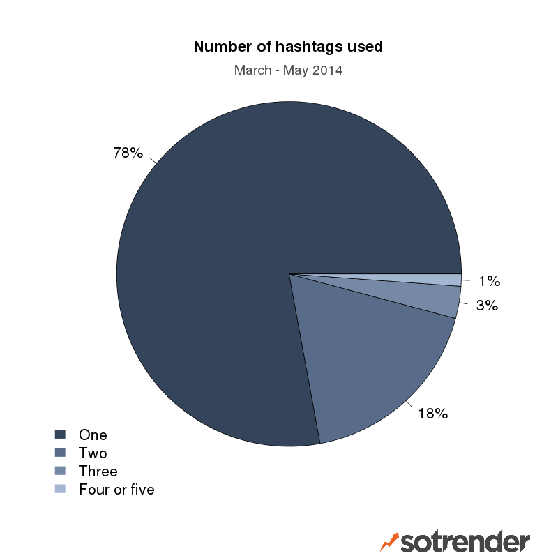 Big brands’ marketers are careful when it comes to the use of Facebook hashtags. Admins of 100 pages under examination published over 12 thousands posts in the three month period (March – May 2014) from which none contained more than five hashtags. Furthermore, in the 77% of posts hashtags weren’t included. Although, as seen on previous graph, such hashtag downscaling is not necessary.