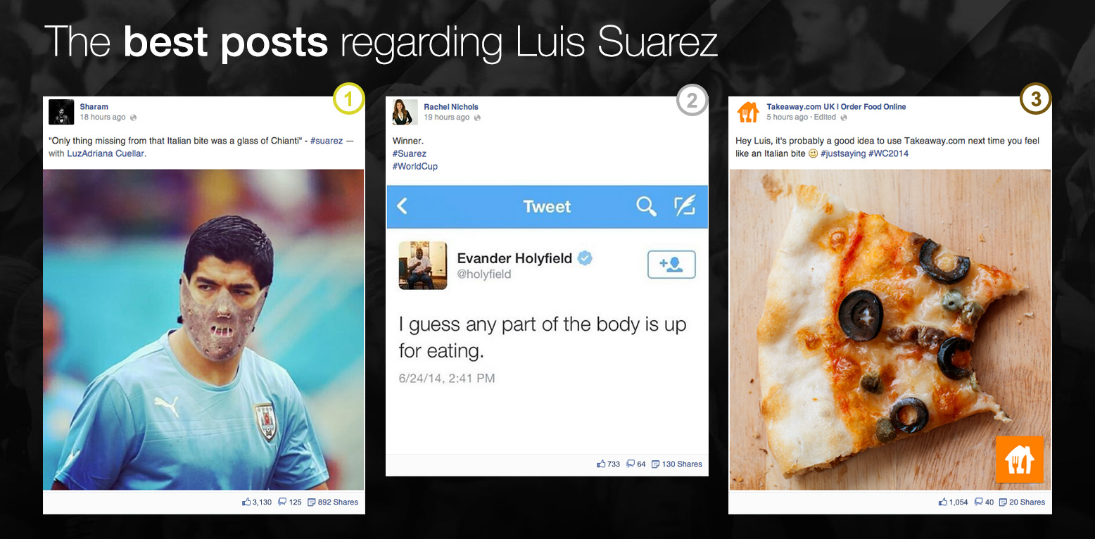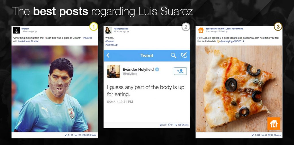 In the 79th minute of World Cup game Uruguay – Italy Luis Suarez bit his Italian opponent Giorgio Chiellini. For Suarez, one of the biggest stars of nowadays soccer, it was the 3rd biting over last years! No wonder, the Internet memes flourished immediately. Furthermore, many brands tried to use this incident for their own real-time marketing, aiming at hijacking the news and attracting the interest. Analysis of Sotrender proved that real-time marketing in social media really worked, bringing very unprecedented high engagement. Moreover, the study enabled us to find the factors which helped the most on Twitter and Facebook – the real-time marketing social recipe for success.
