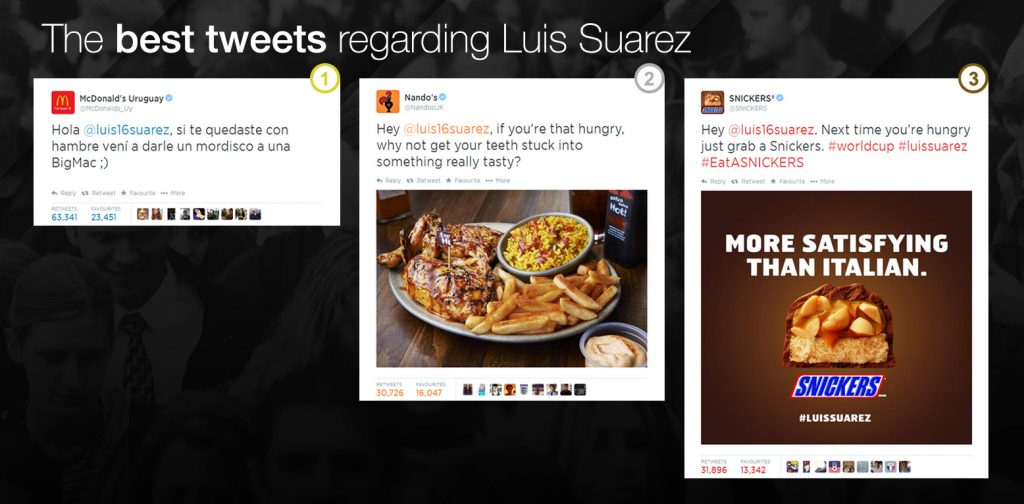 The best tweets regarding Suarez were published by: McDonald’s Uruguay, Nando’s and Snickers.
