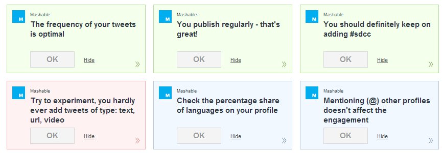Like our automated data-driven tips for Facebook and recommendations for YouTube, the new tips for Twitter are big and visible. With simple call to actions they tell what should be done. One click on a tip is enough to get immediate access to further explanation and the data related to particular recommendation.