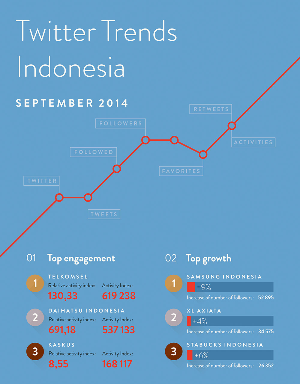 The reports, apart from the rankings of all Indonesian brands, include also results of Facebook Pages and Twitter profiles from 9 categories: automotive, banks, beverages, cosmetics, e-commerce, fashion, food, technologies and telecomunications. The results of each category are divided into different types of rankings.