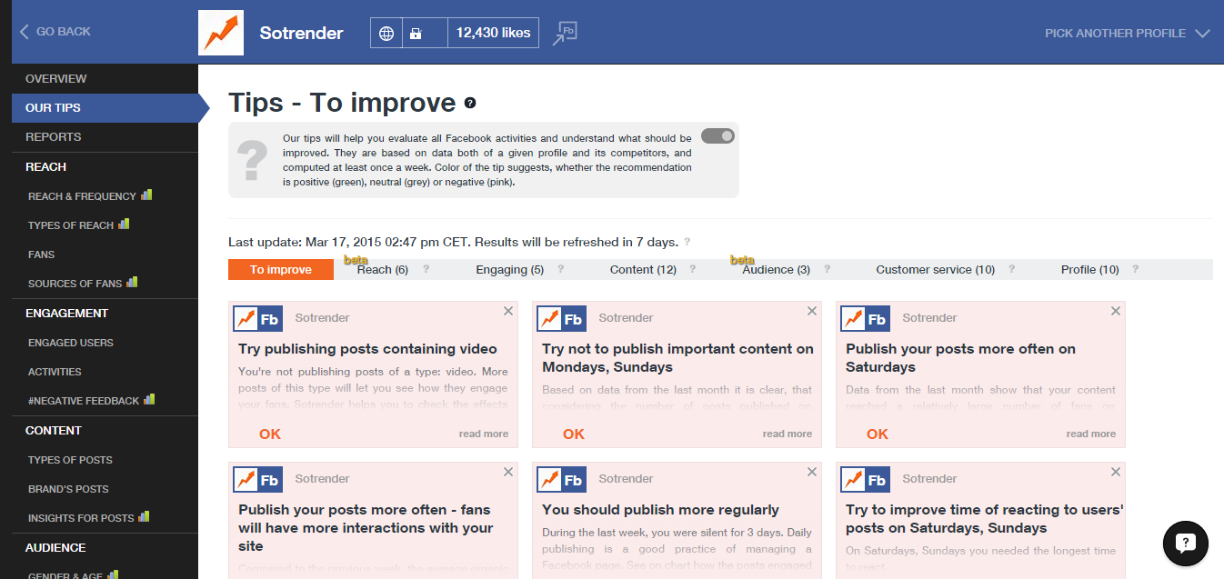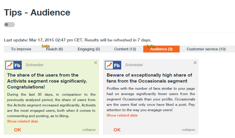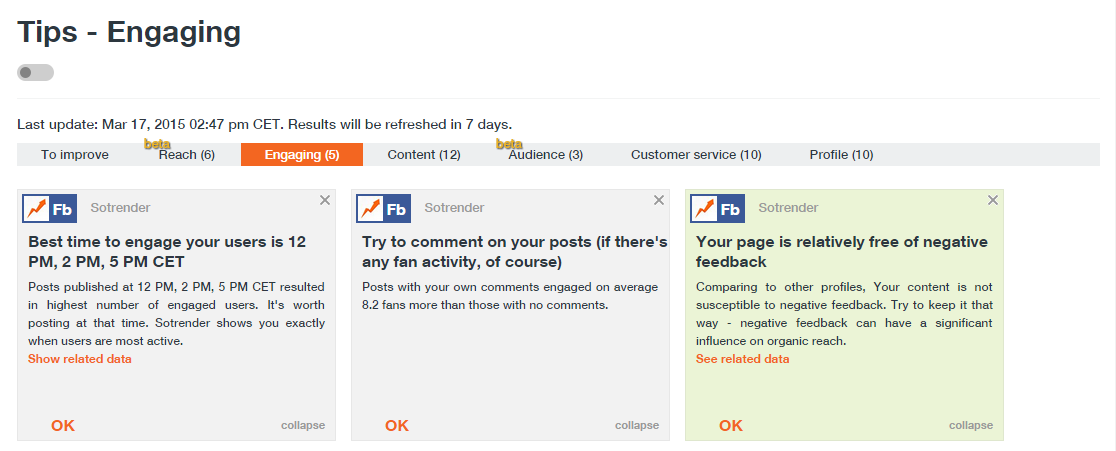 We are still improving our automated tips to make them more precise so that they include more aspects of social media profiles functioning. Yet, it’s only one of many Sotrender features. The tool underwent true metamorphosis in last weeks. We have changed its page and dashboard (here we have added several new features). We have also rebuilt our payment system and introduced new, better pricing with a brand being now basic unit of account. In the same time, we’re working on analytics panel for Instagram and many new features we will introduce soon. Now, feel invited to test new tips on reach and audience!