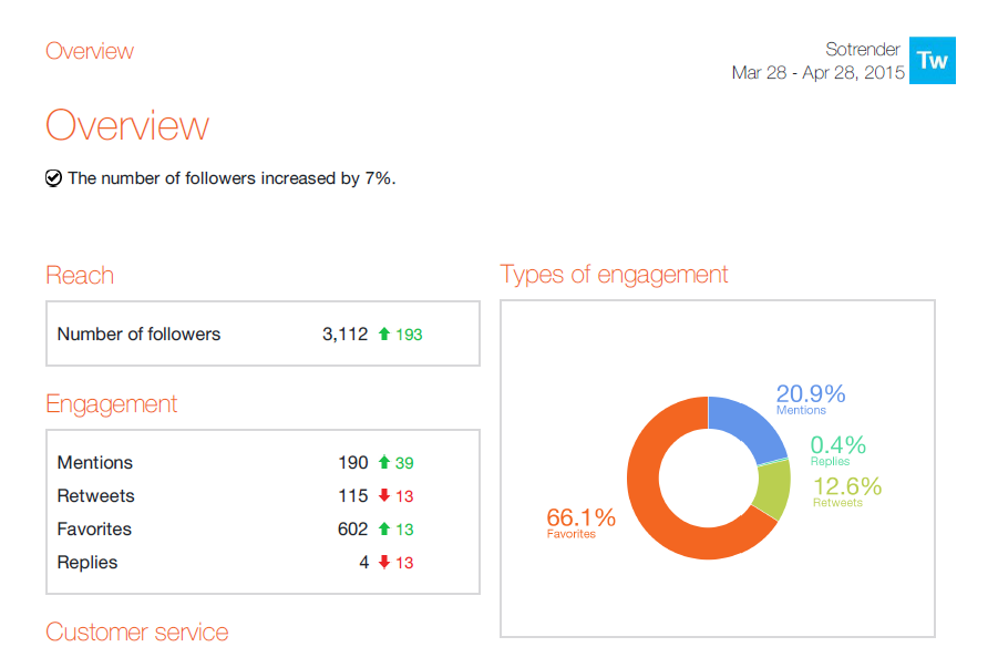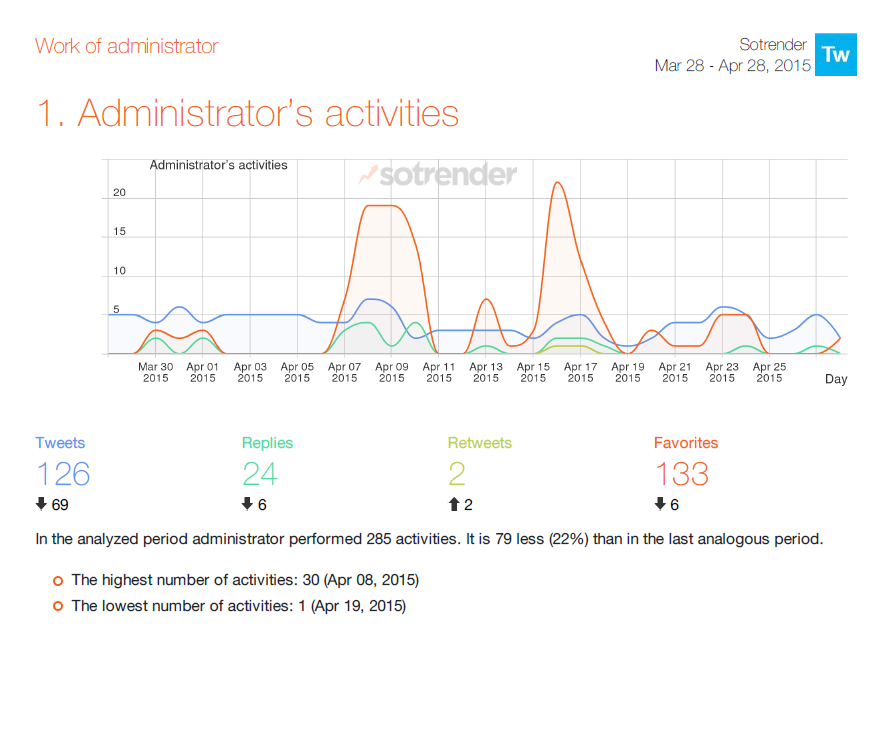 No more illegible charts and thousands of numbers. Automatic Twitter reports in Sotrender are clear and transparent. Professional enough to make a quick print screen and insert it immediately to a business presentation. The colors are bright and more friendly. The reports are organized in chapters. Each chapter contains a summary about different aspects of Twitter activities: reach, engagement, content and admin’s work.