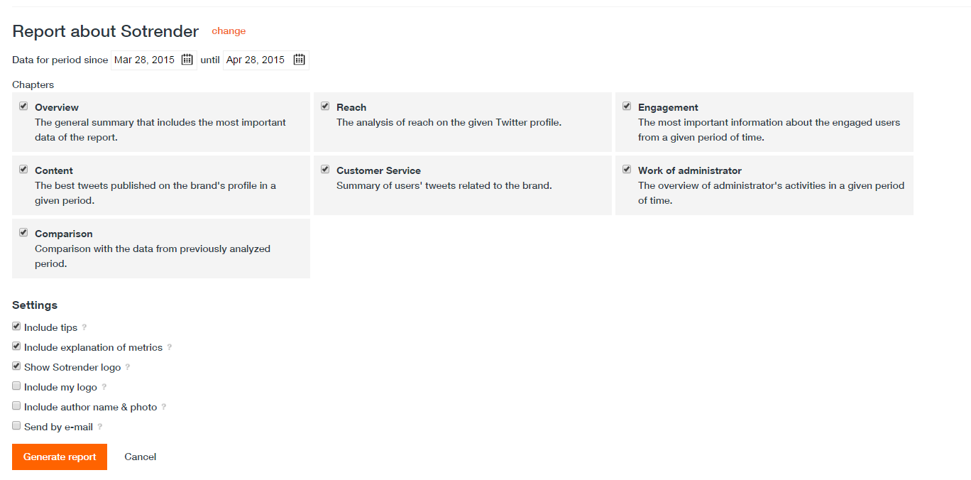 In today’s fast moving world everybody suffers from a lack of time, so we’re doing our best to make Sotrender as useful and time-saving as possible. Thus, we’ve introduced the feature of preparing ultra-fast, professional, and comprehensive PDF reports about Twitter profiles with just a few clicks, just as we did previously with Facebook Pages reports. You can use them to prepare a report at the end of a billing period for clients (if you are an agency) or superiors (if you are a marketeer) on a daily, weekly, or monthly basis. In urgent situations where you have only 5 minutes to prepare a paper, don’t stress out. Log in to Sotrender and see automatic reporting from a completely new and more personalized perspective. Generate your paper, print it, and let us know what you think about our beta reports!