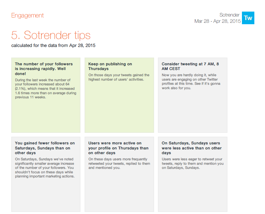 Tips concerning the organization of your Twitter profile, the way you engage users, the content you choose as well as customer service are available also in our automatic Twitter reports. You don’t have to be logged in to be able to tell right away what aspects of your communication should be improved immediately. All you need to do is to tick to include the chapter with automatic recommendations in your report.