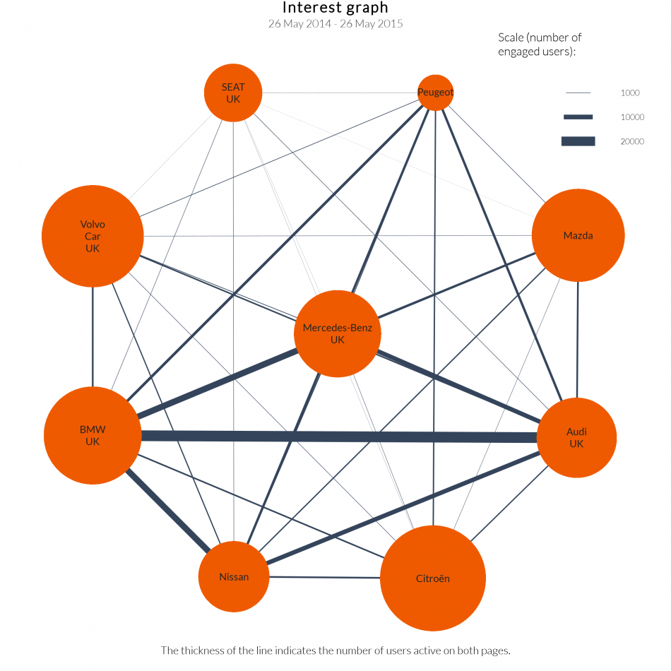 As you can see on the chart, Audi and BMW have the biggest number of mutual users. That’s probably because these two brands compete in the same segment. There are also significant ties between them and the third German brand – Mercedes-Benz. In contrast, Peugeot and Citroen, as well as Nissan and Mazda, being French and Japanese brands respectively, don’t engage the same users as much as German car producers do.