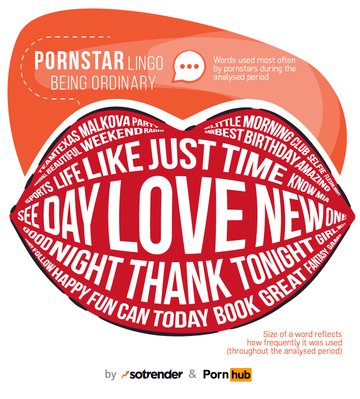 As the wordclouds on the infographic show, lots of love is shared between porn stars and their fans. Porn stars very often use the word “love” as a greeting to their fans, while the fans seem to ascribe a bit more value to it. The majority of post topics revolve around love, beauty, the human body and of course, sex.