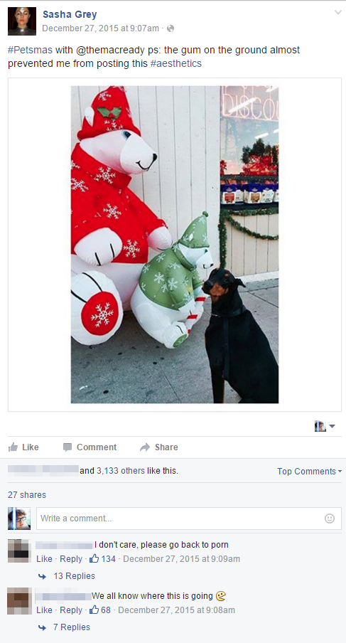 Fans tend to be a bit dirtier than porn stars with their comments. After analyzing over 10k posts, Sotrender discovered that fans prefer to write about sex rather than love. Facebook is full of posts containing love declarations with compliments like “You’re hot, ” “Sexy butt, ” or the very eloquent “Nice ass”. Porn stars are always “cute” and “sweet, ” but their tenderness doesn’t stop fans from asking them for anal sex. It’s also popular to see posts directed to former porn stars in which fans beg them to come back to the porn industry and stop wasting time on “stupid things.” In some cases, those stupid things included, for example, the defense of animal rights… which of course is more than far from being stupid.