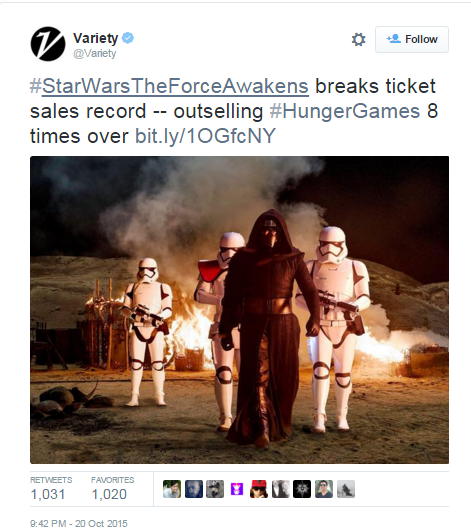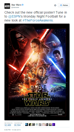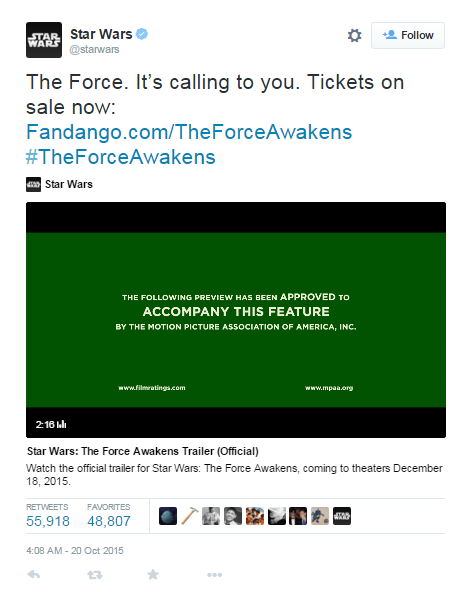 The Force Awakens marketing campaign had been fairly low-key up until the release of the trailer. But since then, it’s turned on it’s hyperdrive and gone into hyperspeed. New posters, interviews, tv spots, international trailers, toys, and more have been bringing Star Wars back into the public eye. And Twitter has been the perfect place to help spread this awareness.