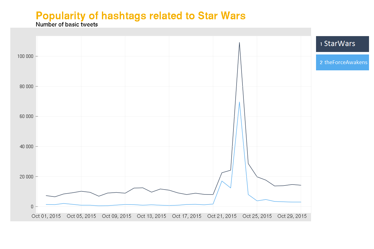 As we can see on the chart, the use of Star Wars and The Force Awakens hashtags blasted up past the 100, 000 mark after the 19th of October. With a mix of well-known characters and set pieces alongside brand new ones, the trailer got people talking about Star Wars like never before.