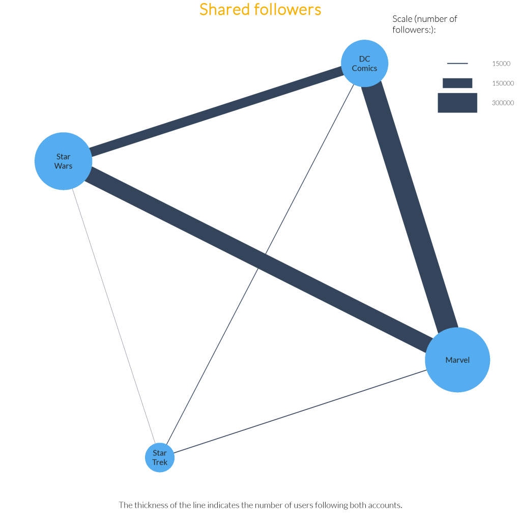 Another other big movie from this year was undoubtably Avengers 2: Age of Ultron. Next year will see an anticipated Batman v Superman movie as well as 3rd Star Trek film (produced by no other than JJ Abrams – The Force Awakens director). Which is quite notable, since it’s pretty well known that Trekkies and Star Wars fans don’t get along too well. Just as DC and Marvel fans don’t. You can never be to sure though, so we decided to check if it’s true by conducting a shared interest analysis.