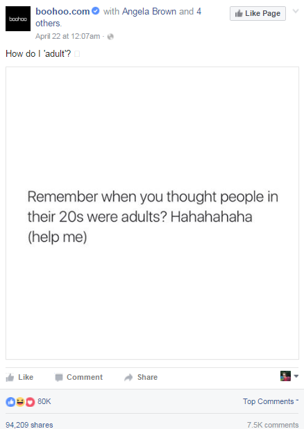 This month’s best post was a humorous one, this time coming from boohoo.com. The post in question shared a self-depreciating meme making fun of 20 year olds, one that is unfortunately all too relatable. It’s also the reason why it got so much activity. For less serious social media profiles, humor and fun are always great ways to boost engagement.