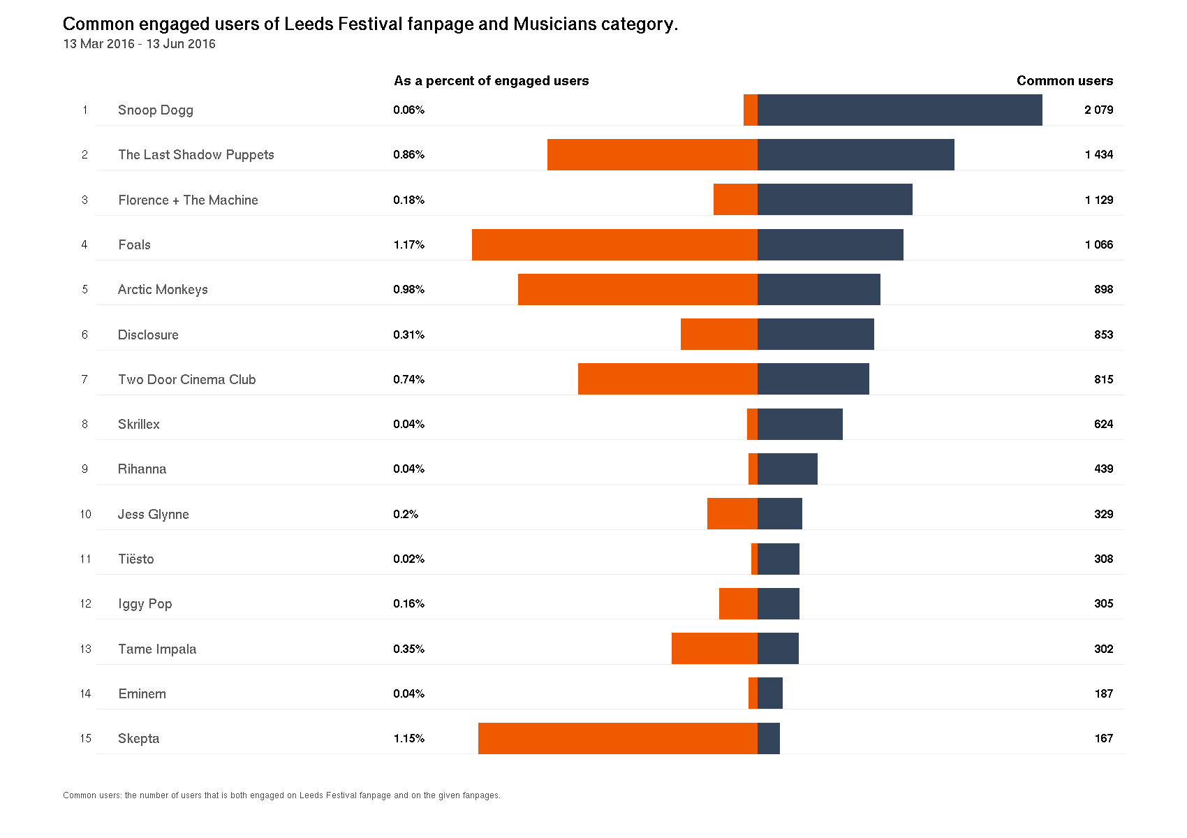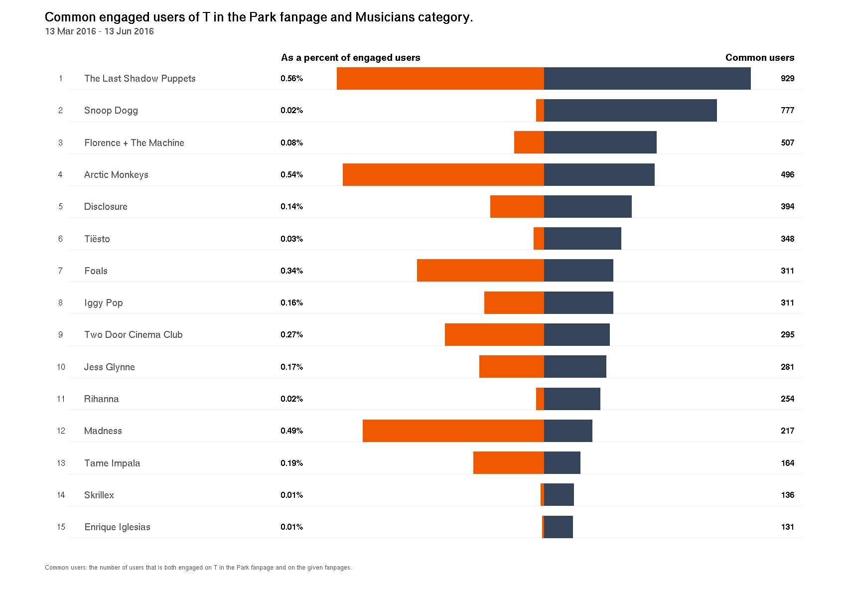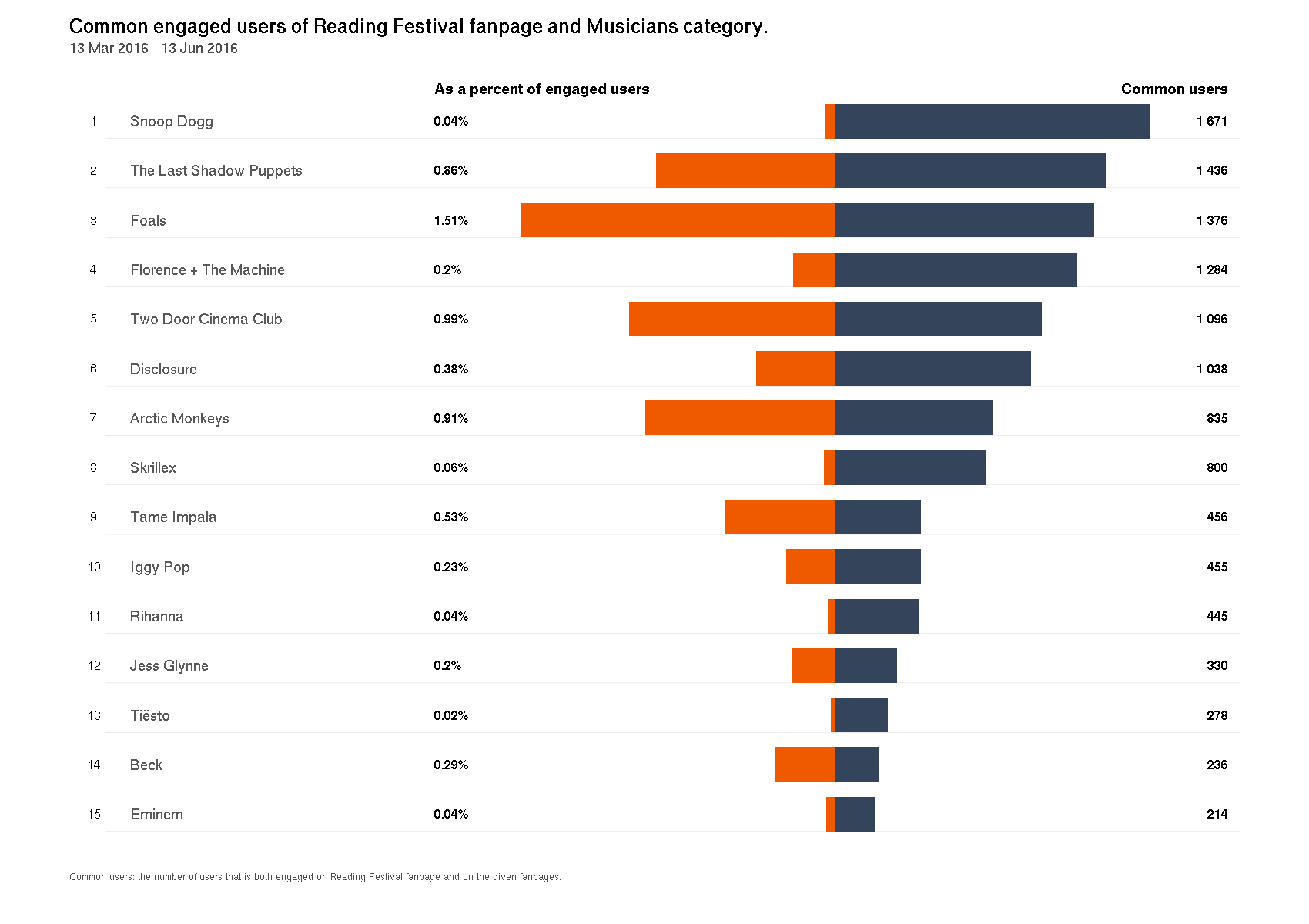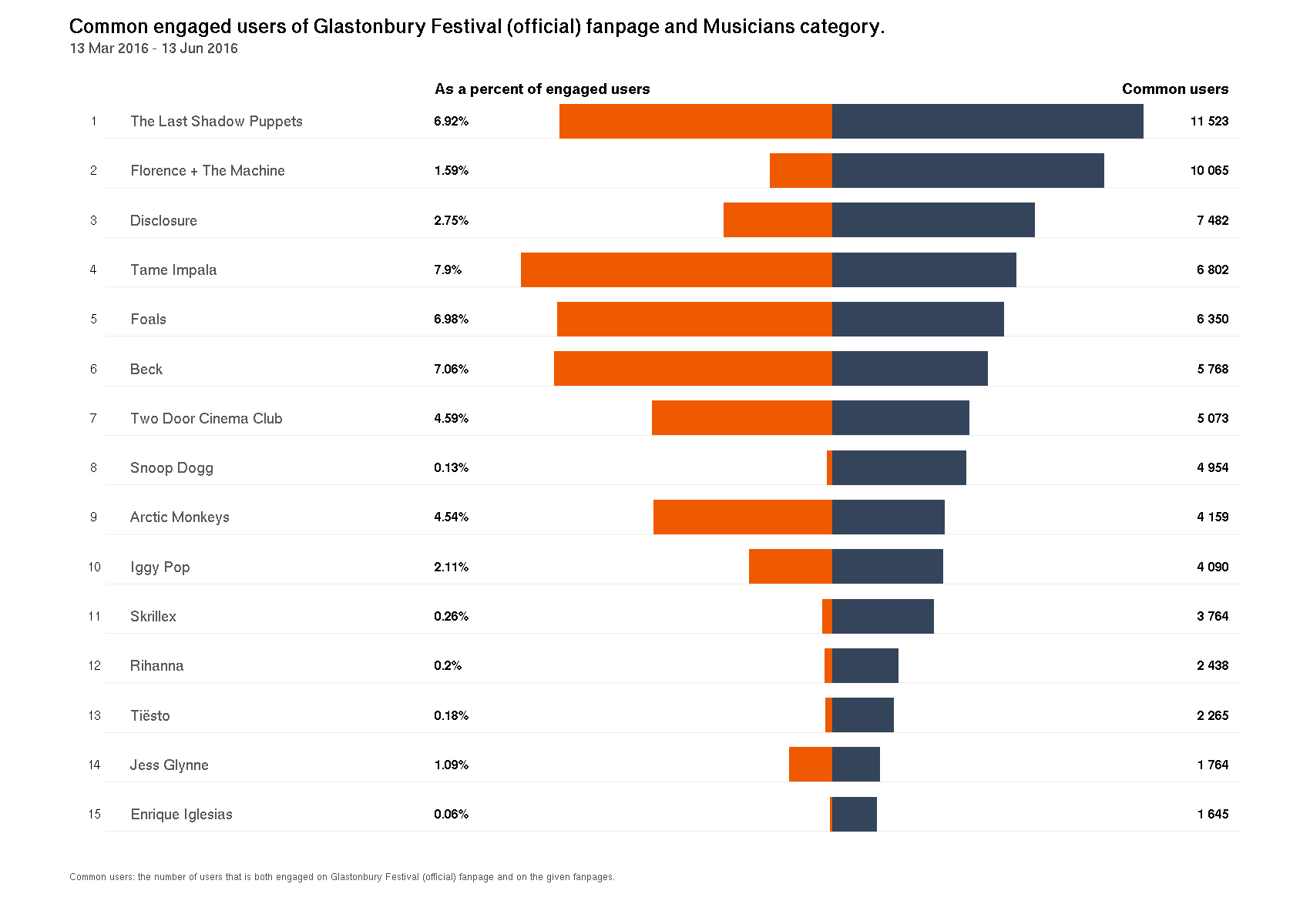 Let’s have a closer look at Glastonbury festival. In the chart below you’ll see the shared fans between artist pages and the festival page, as well as the percent of engaged users.
