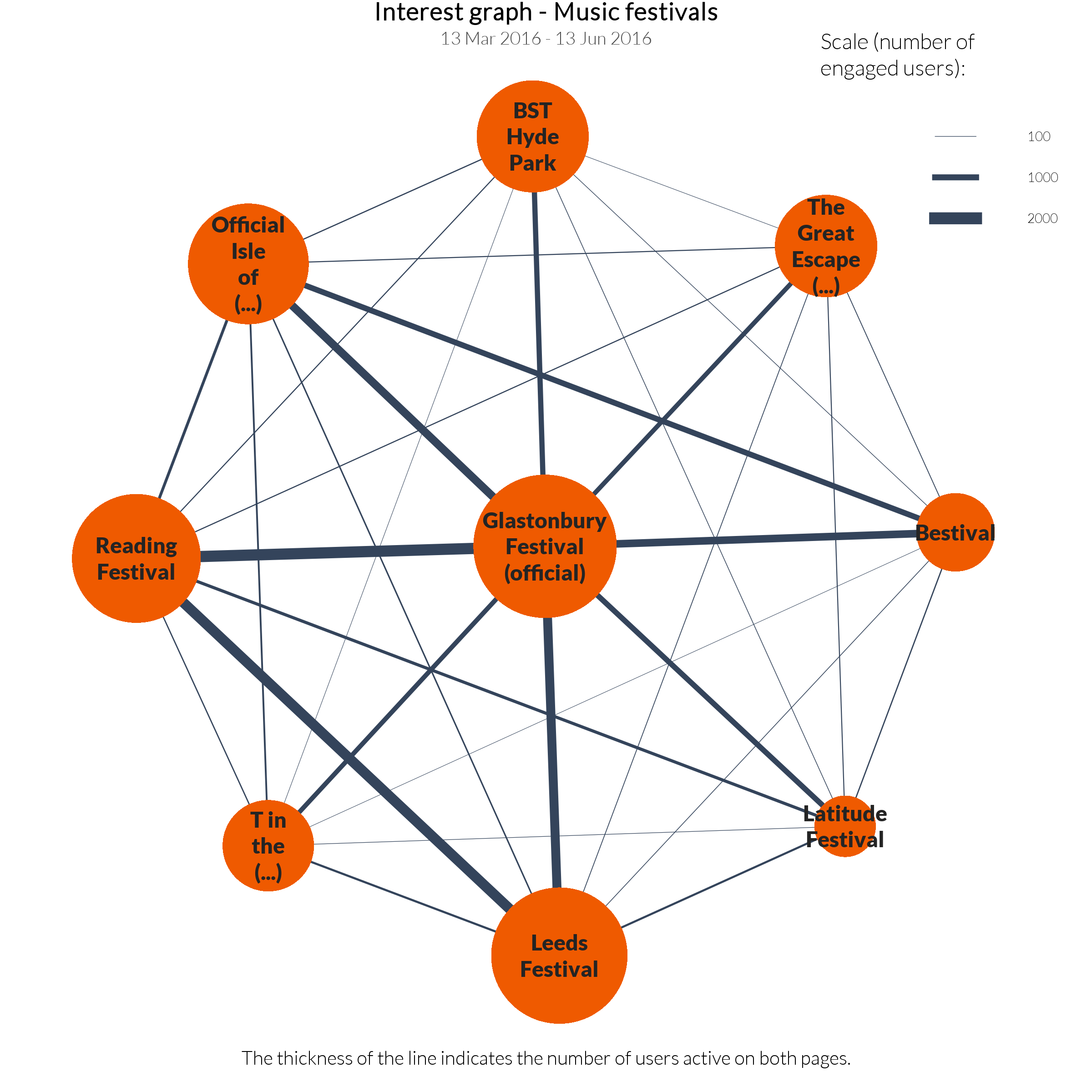 There was also lots of mutual interest between Reading and Leeds with Glastonbury. This is likely because of Galstonbury’s general popularity, as it also shares a lot with fans with a few other festival pages.