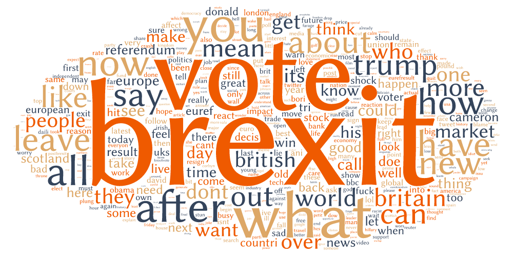 What keywords were people using during the reactionary moments just after the Brexit decision? Let’s have a look. This word cloud is based on 760 thousand basic tweets analyzed, searching for the most popular keywords, excluding hashtags: