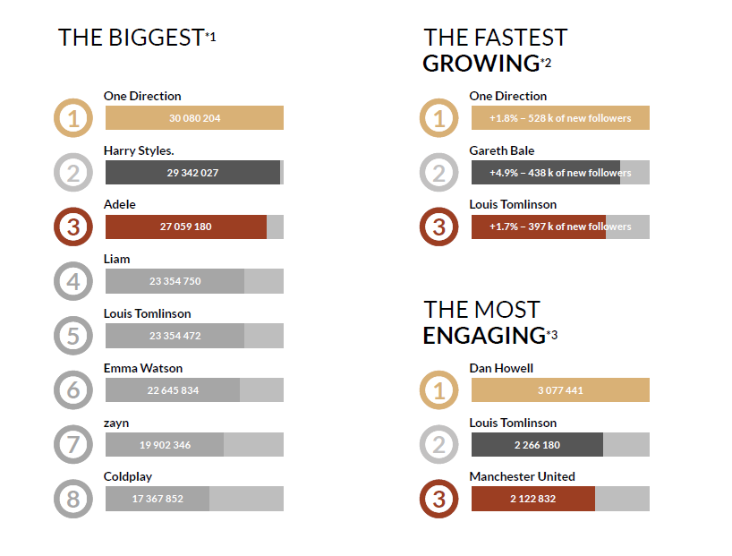 Speaking of massive and rabid fanbases, One Direction completely outperforms everyone else on Twitter. Being the biggest profile account, they’ve maintained a steady streak of being at the top of Twitter UK for the entire time we’ve been making monthly Twitter reports. Their members are in each of the ranking, and they know how to appease they’re massive amount of fans. They aren’t exactly doing anything special, but they know how to maintain the status quo.