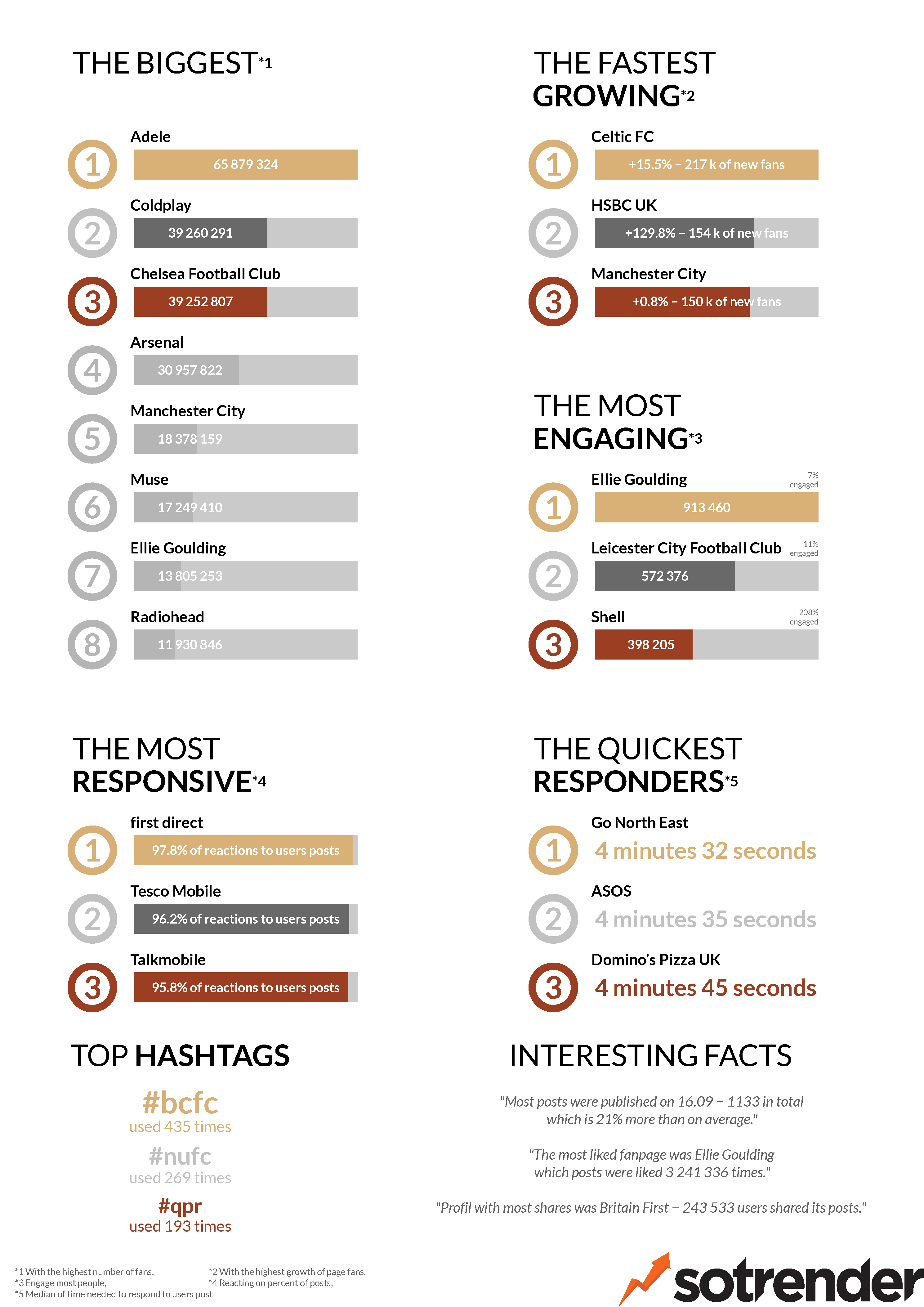 The biggest brands changed a little this month, with three additions to the top ranking profiles. Chelsea Football Club (39m fans), Arsenal (30m fans), and Manchester City (18m fans) we’re added to the analysis and knocked some other brands down in the ranking. It’s no surprise though, as football clubs garner a huge amount of engagement not just on Facebook, but Twitter too. Adele and Coldplay still have the most fans on Facebook, respectively.