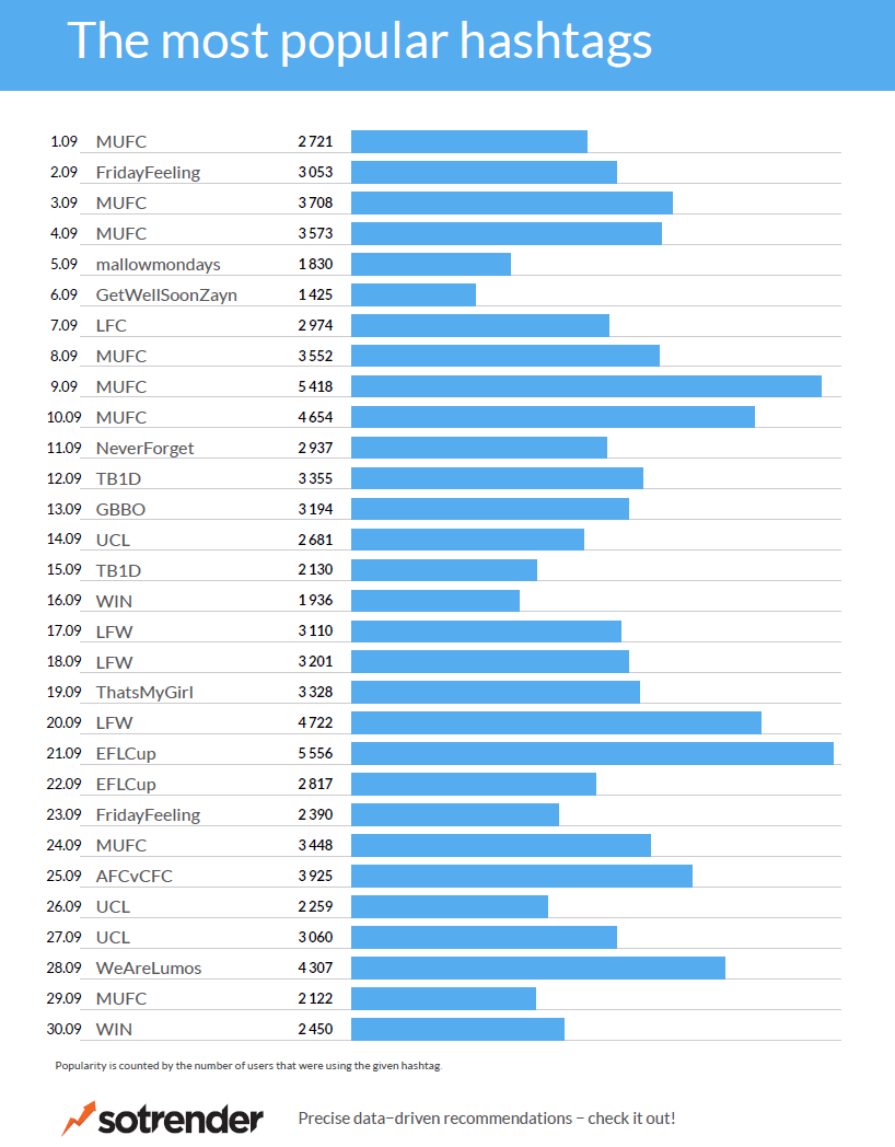 This September, English football clubs lead the way with the most successful hashtags. The top three most used hashtags were #MUFC, #mcfc, #LFC, each representing a different english football club. #MUFC was by far the most trending hashtag this month, as it was the most used tag for 8 days of the month. The only other noteworthy trend was that of London Fashion Week, which was gaining lots of traction for a few days with the #LFW tag.