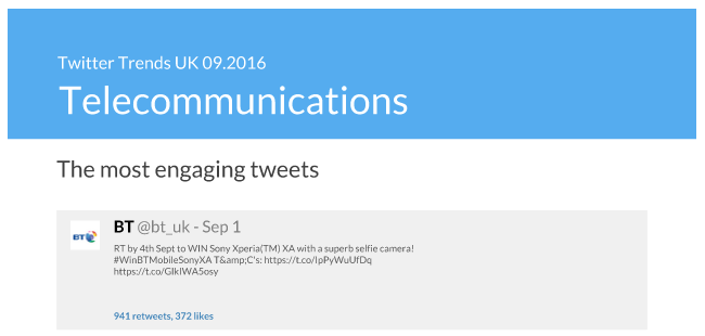 - Contests work! They usually engage your audience and spread out your reach. Just take a look at this example from our reports – the most engaging tweet in the ‘Telecommunication’ industry was a contest post, where @BT_UK asked Users for retweets (RT). People always love contests, so you should make the most of it, using your reach, products, or services!