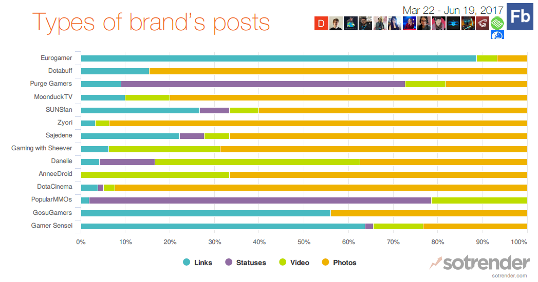 We can see that Purge Gamers and PopularMMOs for example relied mostly on Statuses for their post types while DotaCinema relied mostly on Photos and then Danelie was heavily reliant on video posts. This can be explained by the fact that Purge Gamers and PopularMMOs are streamers/casters who rely heavily on Twitch and YouTube for their main activities while DotaCinema uses photos to promote the content they create and then use it to redirect users to YouTube.