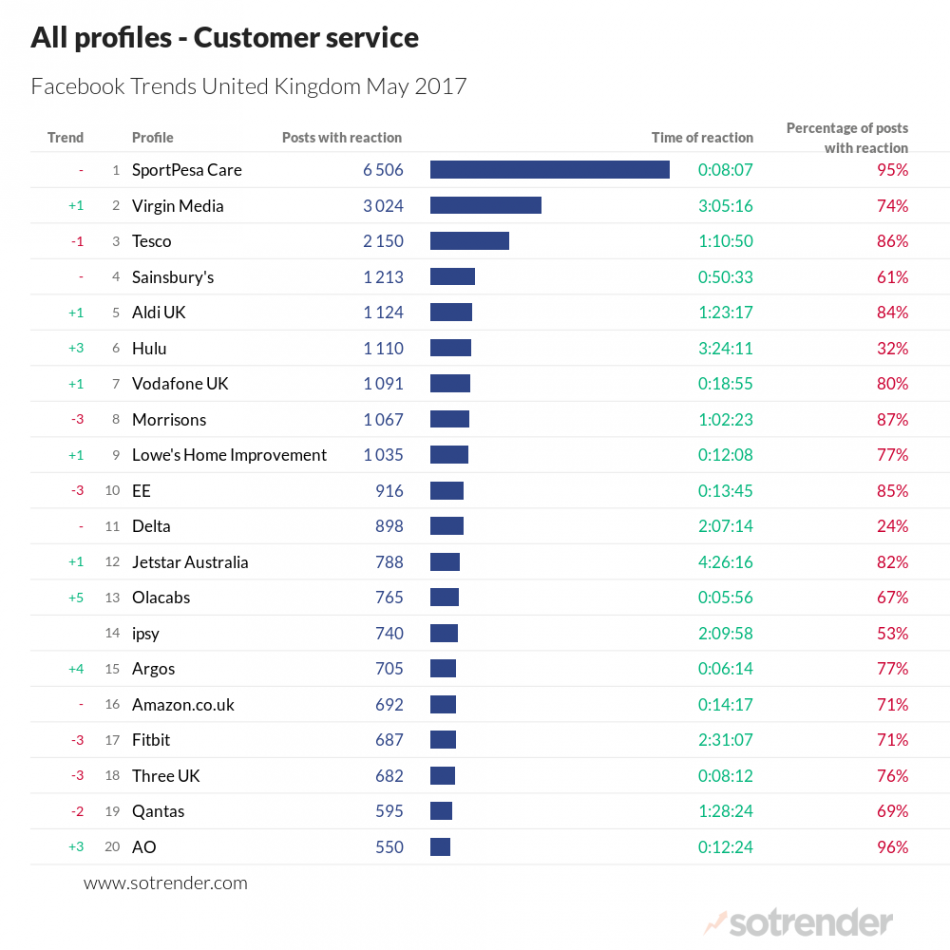 Customer service on Facebook can do wonders for your brand. It might not have been the first thing to cross your mind, but you should give it a look! It can strengthen your brands online presence and improve your fans opinion of you. And if you need any inspiration, just check out these top performers: SportPesa Care (6 506 reactions), Virgin Media ( 3 024 reactions), and Tesco (2 150).