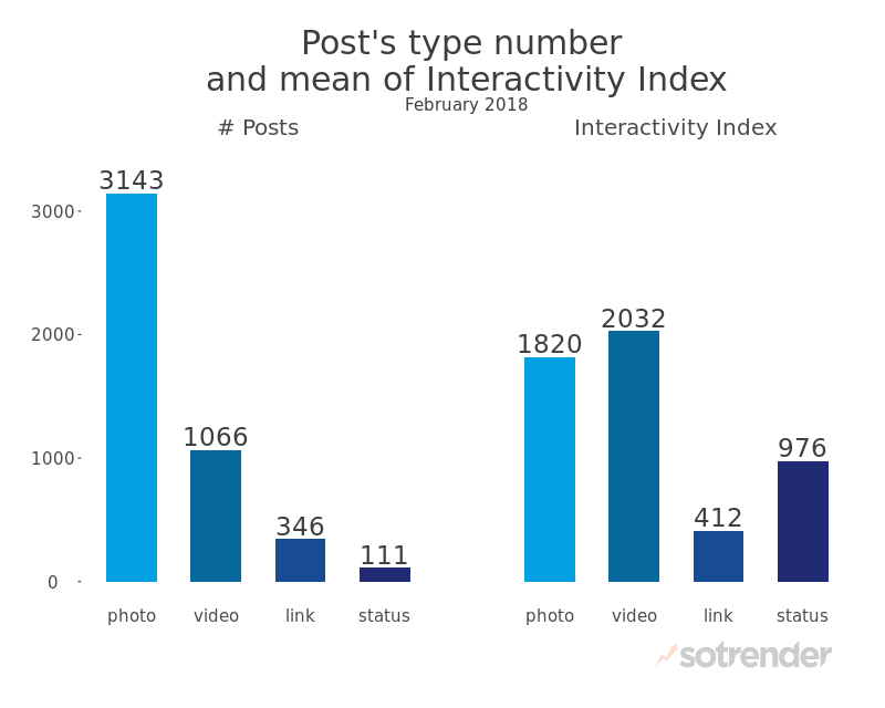 We can clearly see an association between the Interacivity Index and the type of post created with statuses having the highest ratio of Interactivity Index to # of Posts, followed by link posts, video posts and finally photo posts as prepared by Maciej Baranowski from our Data Science team for the retail sector. This is quite unusual since with other brands or pages usually video posts are the ones that have the biggest reach and interactivity indeces while statuses and link posts don’t perform as well.