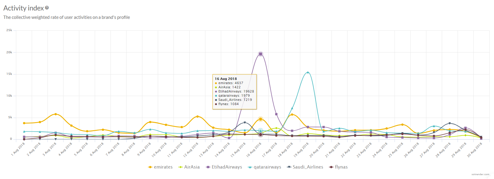 Asian and Arabian airlines are generally very active on social media, and Emirates are no exception. But of all the airlines we compared, Emirates have the highest engagement rate on Twitter (Activity Index).
