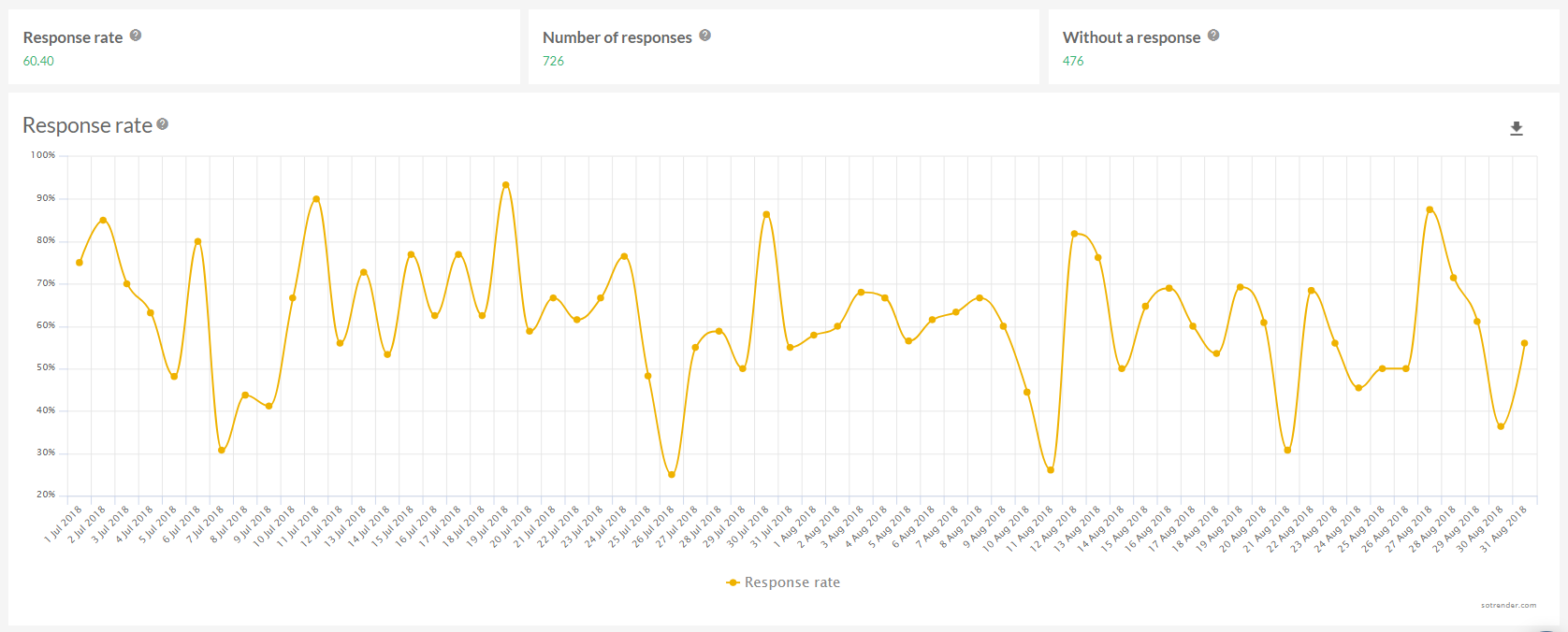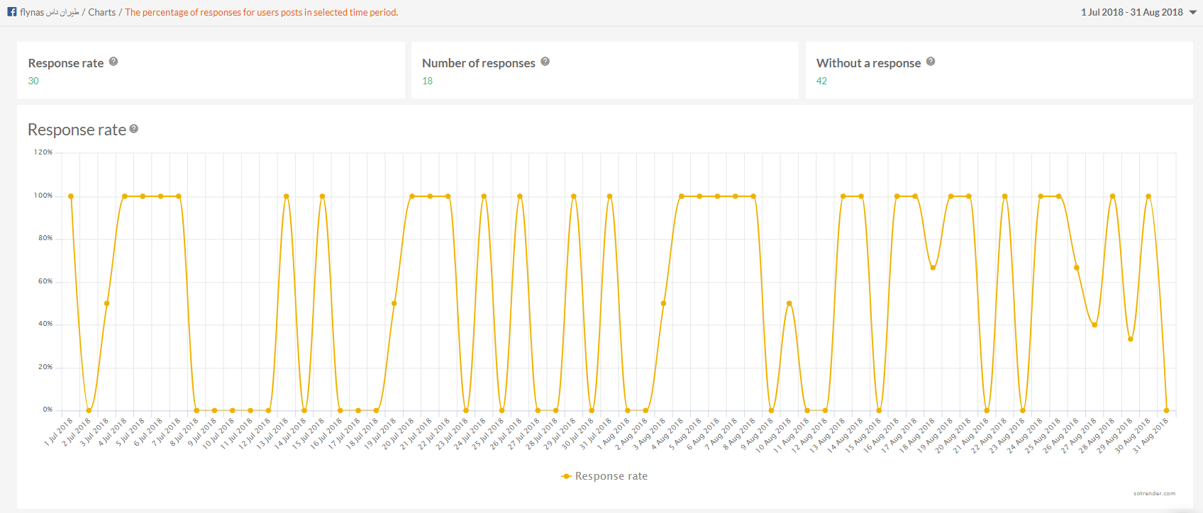 Emirates airlines are quite responsive on Facebook. In July and August, they responded to 726 posts (which is more than 60% of all received). On average, it took them close to 8 hours to respond, a pretty good result!