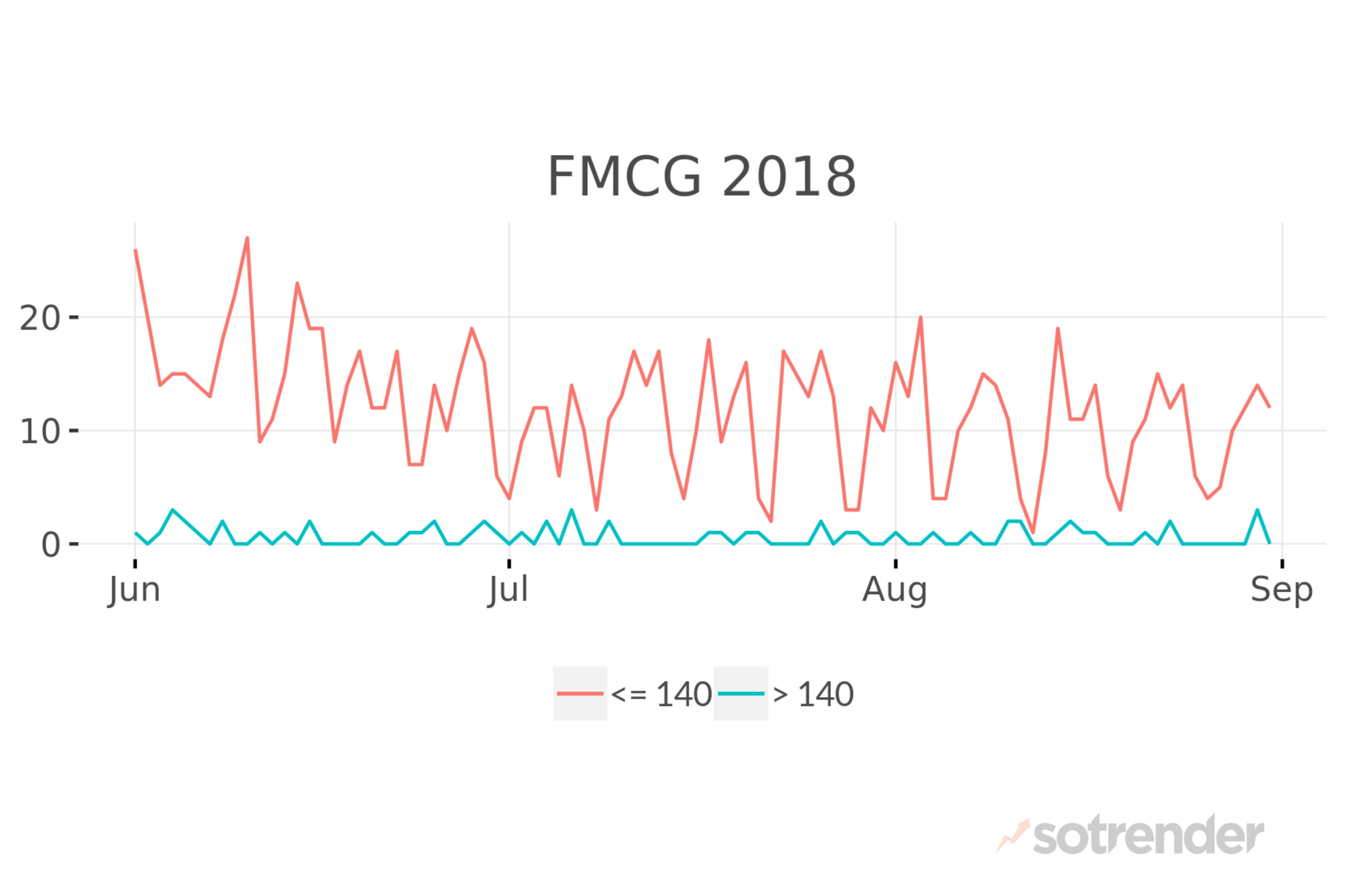 The most significant decrease can be observed in FMCG, as brands in this segment post less frequently than, for example, Media brands. Brands like Clinique UK, Munchies UK or Macknade Fine Foods now tweet even 2-3 times less than a year ago. With this number, the decline is easily visible.