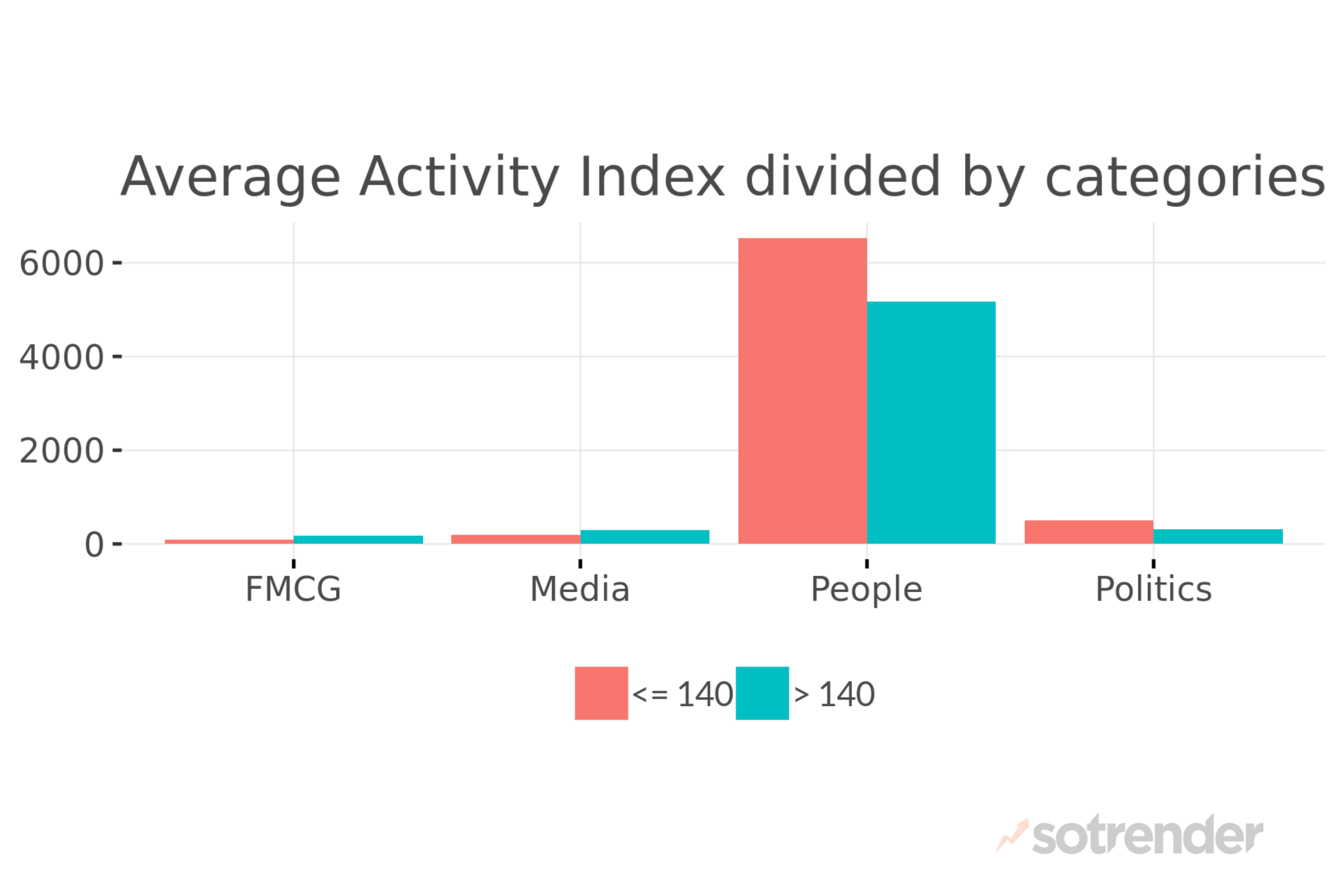 Still, engagement even in FMCG and Media profiles is higher when longer tweets are posted. An exception is Politics – this is where shorter tweets seem to perform better.