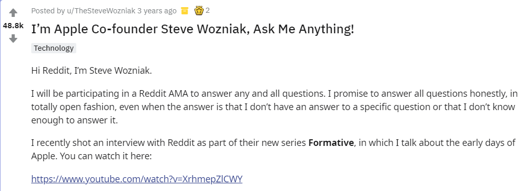 For instance, here’s how Apple’s co-founder, Steve Wozniak, started a discussion on Reddit. He went on the subreddit r/IAmA and started a post with Ask me Anything (AMA) in the title. This is an effective way to communicate with your audience on different platforms.