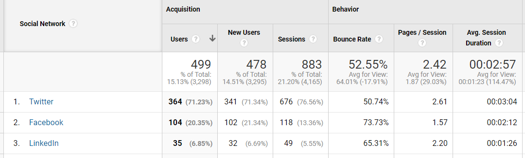 For example, you might discover that you’re getting the most traffic from Facebook but your Twitter traffic is actually clicking around and converting once they’re on-site.