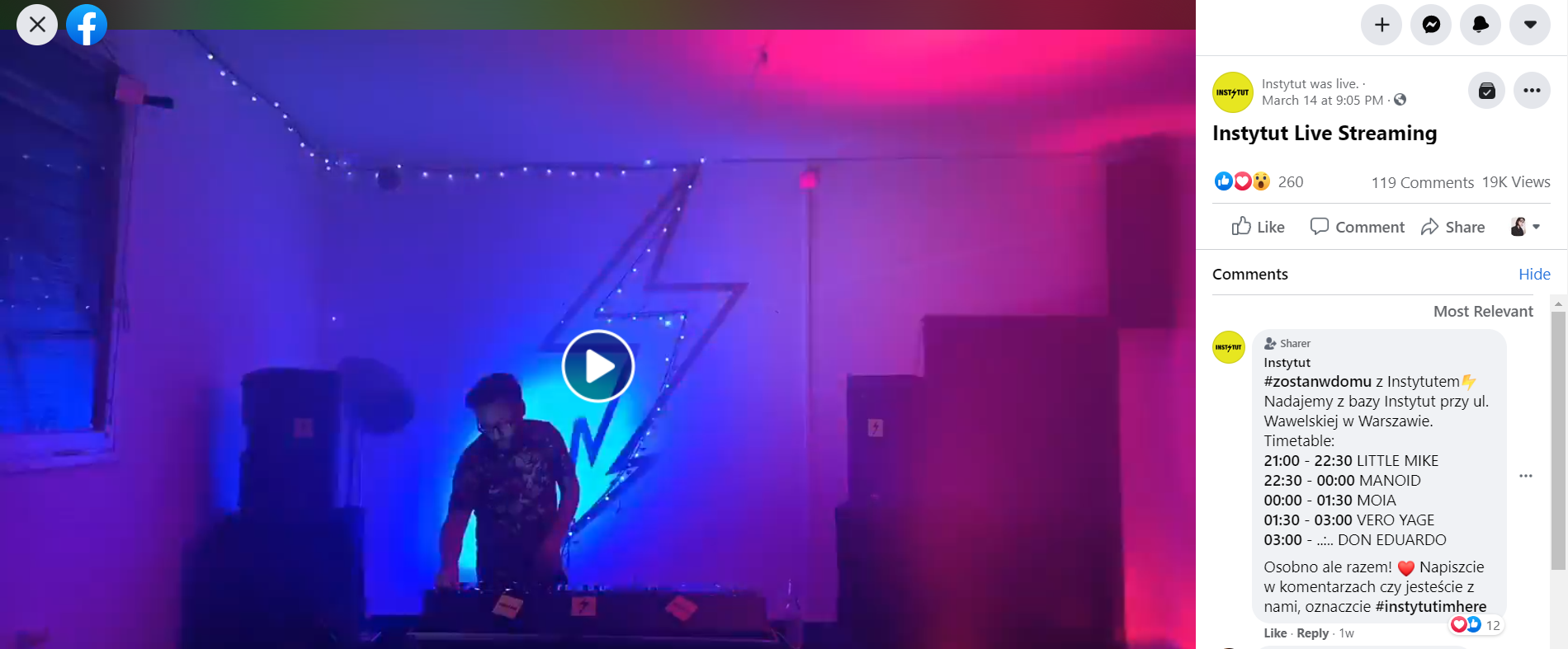 For example, Instytut, a music and art festival that takes place a few times a year in Poland, has a very active community, both on its Facebook Page and their closed Facebook group. The organizers decided to do the best they can under the circumstances and asked DJs to perform their sets over Facebook Live for free. The online “rave” had between 1,300 to 19,200 viewers, depending on the artist performing, and they encouraged the audience to use the hashtag #instytutimhere so they can stay “separated but together”.