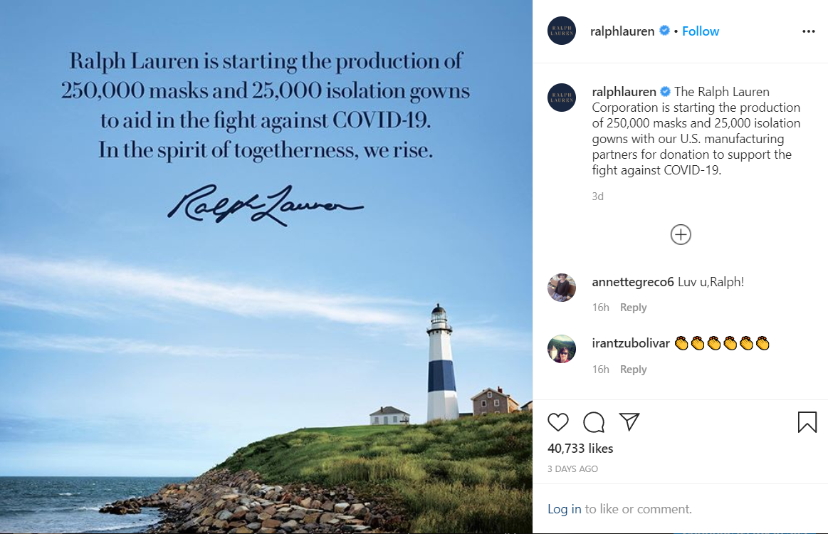 High fashion brands such as Ralph Lauren have donated 10 million USD to various charities and will be making 250,000 face masks and 25,000 hospital gowns.