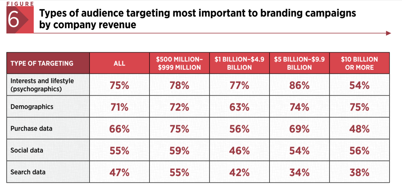 They found that psychographics and demographic targeting are the most important for companies’ campaigns across almost all levels of revenue. This is something to consider when you start to plan your next ad campaigns and how to narrow down your audience.