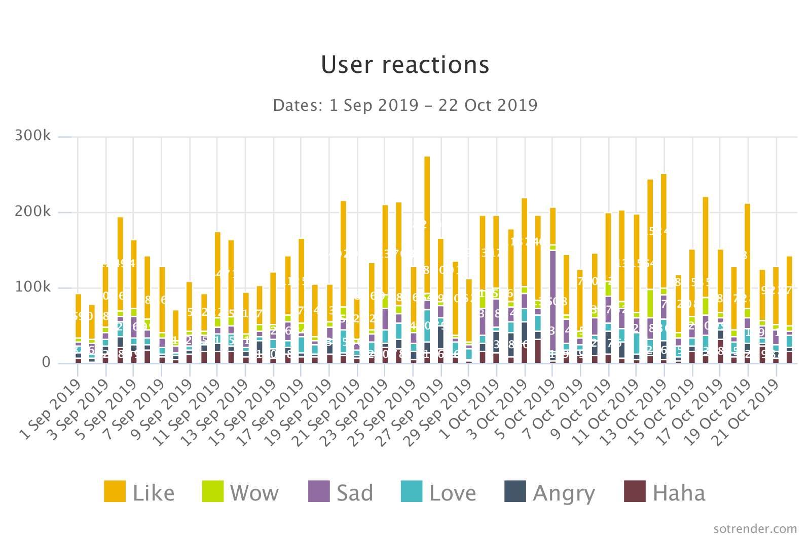 For example, if you wanted to know how your competitor’s audience is reacting, you can immediately get the answer from this type of chart from Sotrender. For this one, you don’t need to have access to an Insights profile because this is public data.