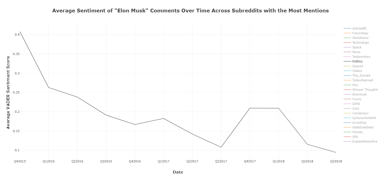 Here’s a graph that illustrates the sentiment of user comments about Elon Musk over time on Reddit, thanks to the user anthonytxie.