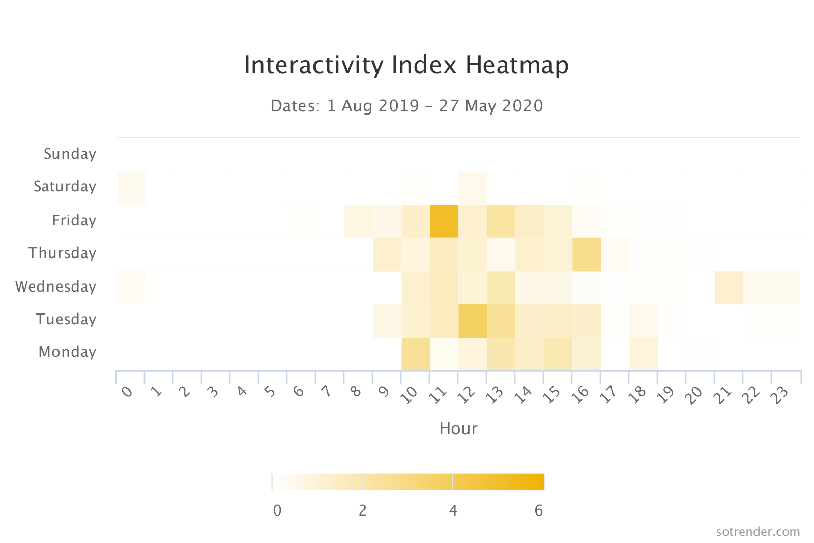 About the graph: the darker the time slots on the heatmap, the higher the activity at the time. Blank or faded greens indicate no or very small levels of activity. The data in the heatmap represents engagement in 2019.