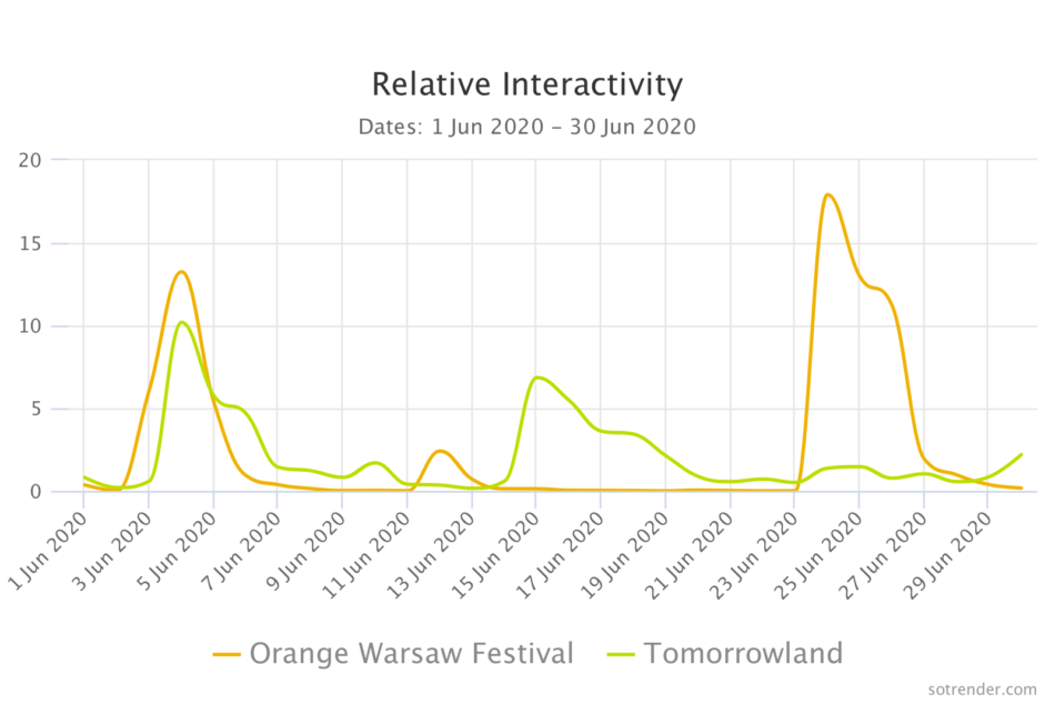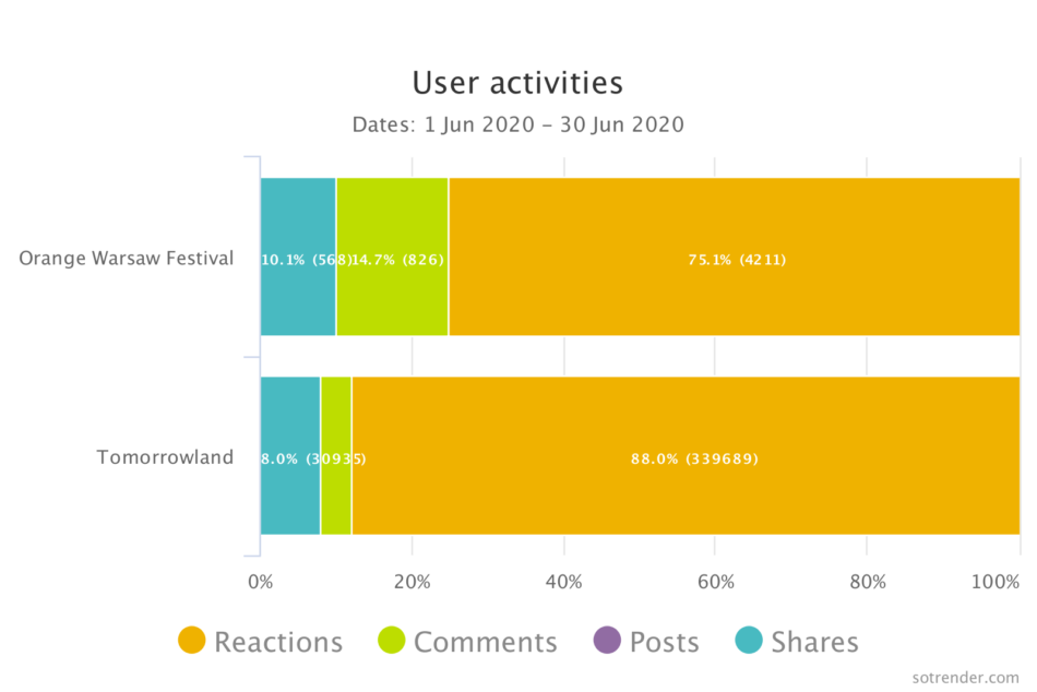 Here’s an example of two music festivals. Tomorrowland had over 14 million fans on Facebook in June of 2020, but Orange Warsaw Festival had 200k. Of course, Tomorrowland will have a higher number of reactions than Orange, but proportionately, Orange has better engagement.