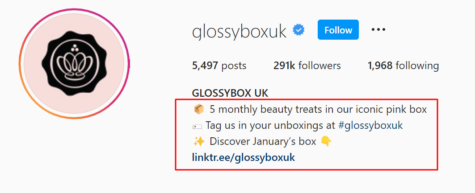 Check out how Glossy Box, a beauty subscription brand, directs its followers to a page where they can sign up for a subscription box service.